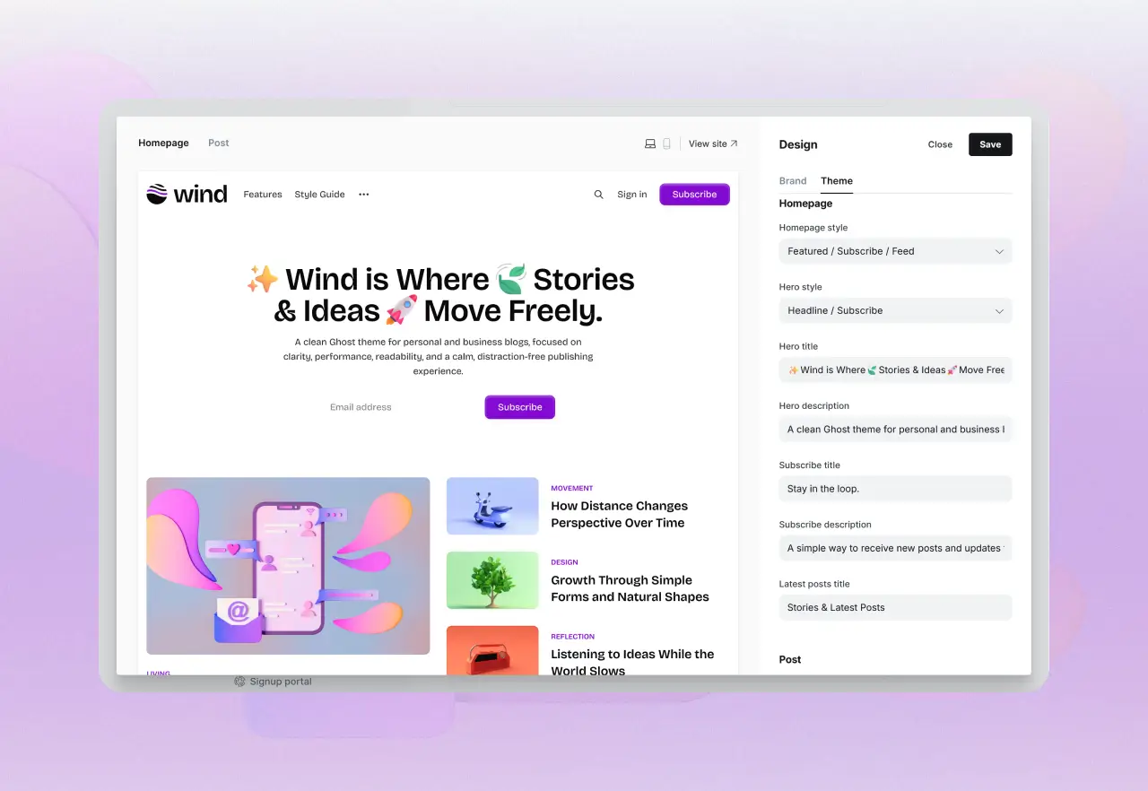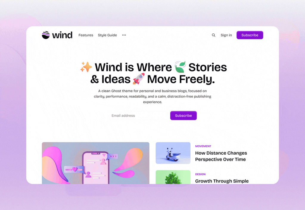 Buy Now - $79Wind is a modern Ghost theme designed for clarity, balance, and thoughtful publishing. Built for agencies, personal blogs, storytelling, and business content, it offers a clean structure, refined typography, and a calm visual rhythm that keeps the focus on content without unnecessary distractions.