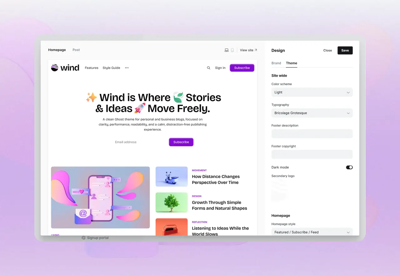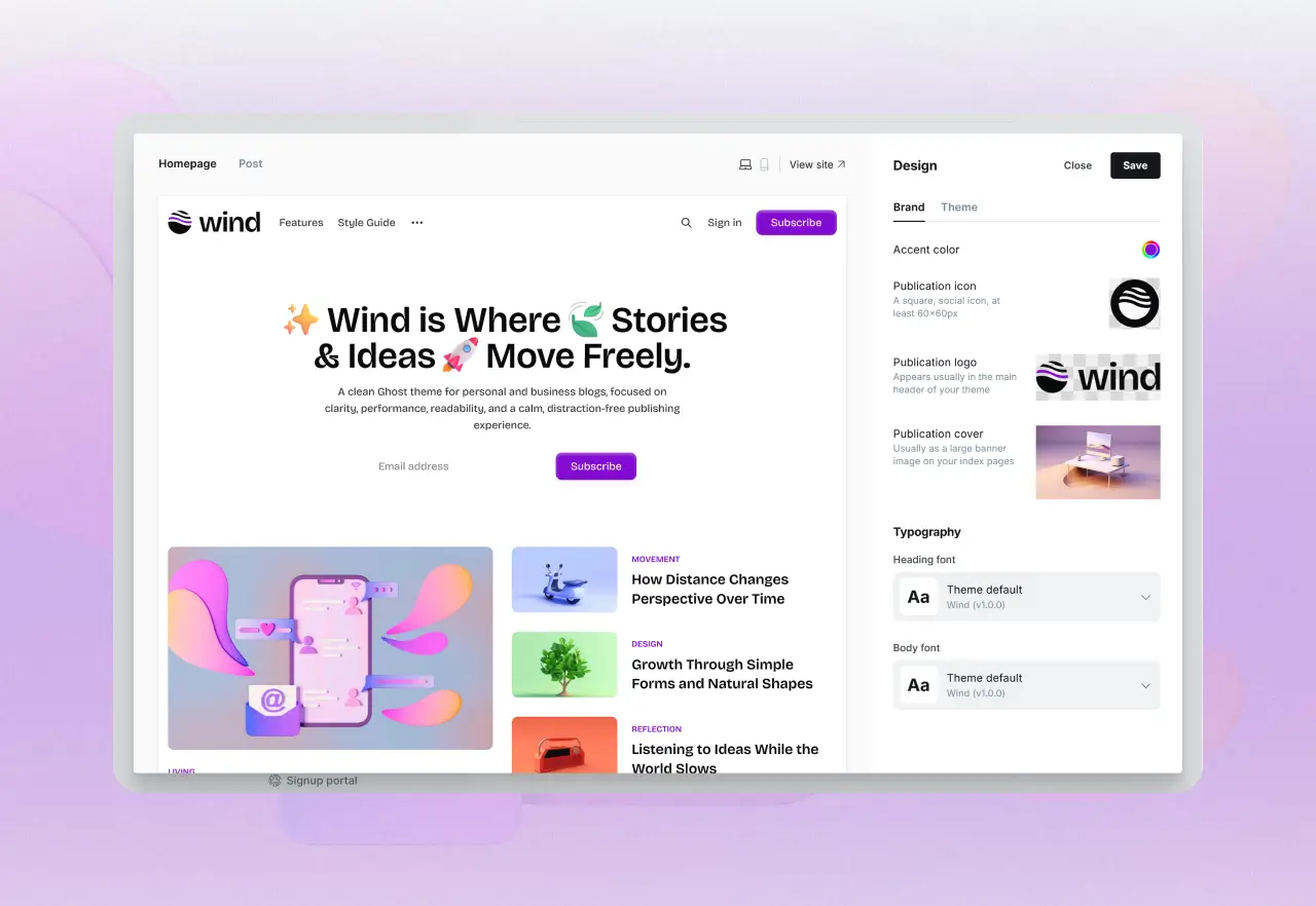 Personalize your site with clarity and control. Wind includes a wide set of customization options available directly in the Ghost Admin. In the brand section, choose an accent color to define the visual identity of your site. Choose between local or system fonts, upload a publication cover image used in the subscribe section, add your logo and favicon. With more than 20+ custom settings, Wind gives you flexibility while keeping the setup simple and consistent.