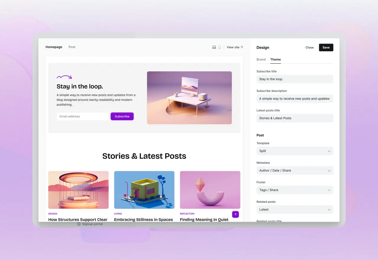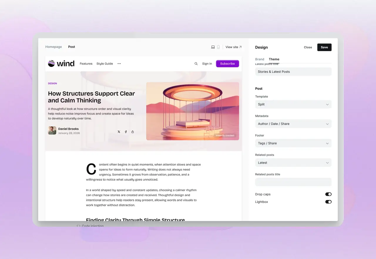 Create layouts that reflect your publication’s personality. Wind includes multiple templates for posts and pages, allowing you to choose between Classic, Split, and Wide layouts. Each option presents content in a clear and comfortable format, with support for metadata, tags and sharing, related posts, optional drop caps, image zoom, and full Editor Cards compatibility.